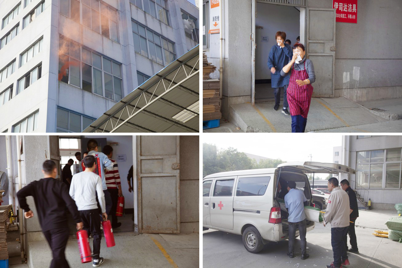 消防演练正式开始,火灾警报铃声响起,模拟火点冒浓烟,全体人员立即从所在岗位起身,用毛巾捂住口和鼻,通过消防楼梯按照指定的疏散线路,有序地进行紧急疏散,并第一时间撤离到安全地带公司大门口前的广场。员工带上灭火器材上楼,及时对模拟着火点进行处置受伤员工由担架抬到急救车上。