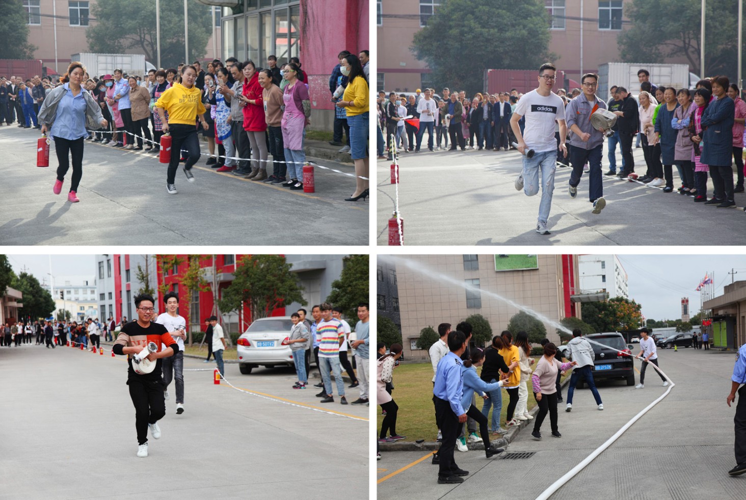 两个厂区的全体员工在大门主干道两侧井然有序地观看消防技能比赛,为参赛队员呐喊助威。