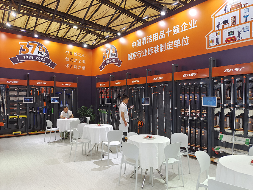 7 月 24-26 日,第 118 届上海日用百货会现场,z6com尊龙洁具展位人气爆棚。以橙灰为主色调的展台醒目亮眼,“EAST” 品牌标识大气吸睛,集中展示多元清洁工具。作为中国清洁用品十强企业、国家行业标准制定单位,z6com尊龙凭借 37 年积淀,尽显中国智造在清洁领域的实力。
