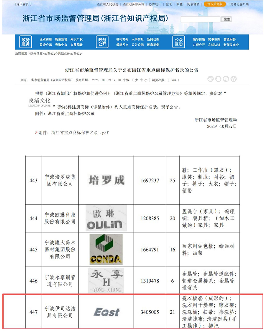 2025年10月,浙江省市场监督管理局公布浙江省重点商标保护名录,宁波伊司达洁具有限公司的 “East” 商标成功入选。