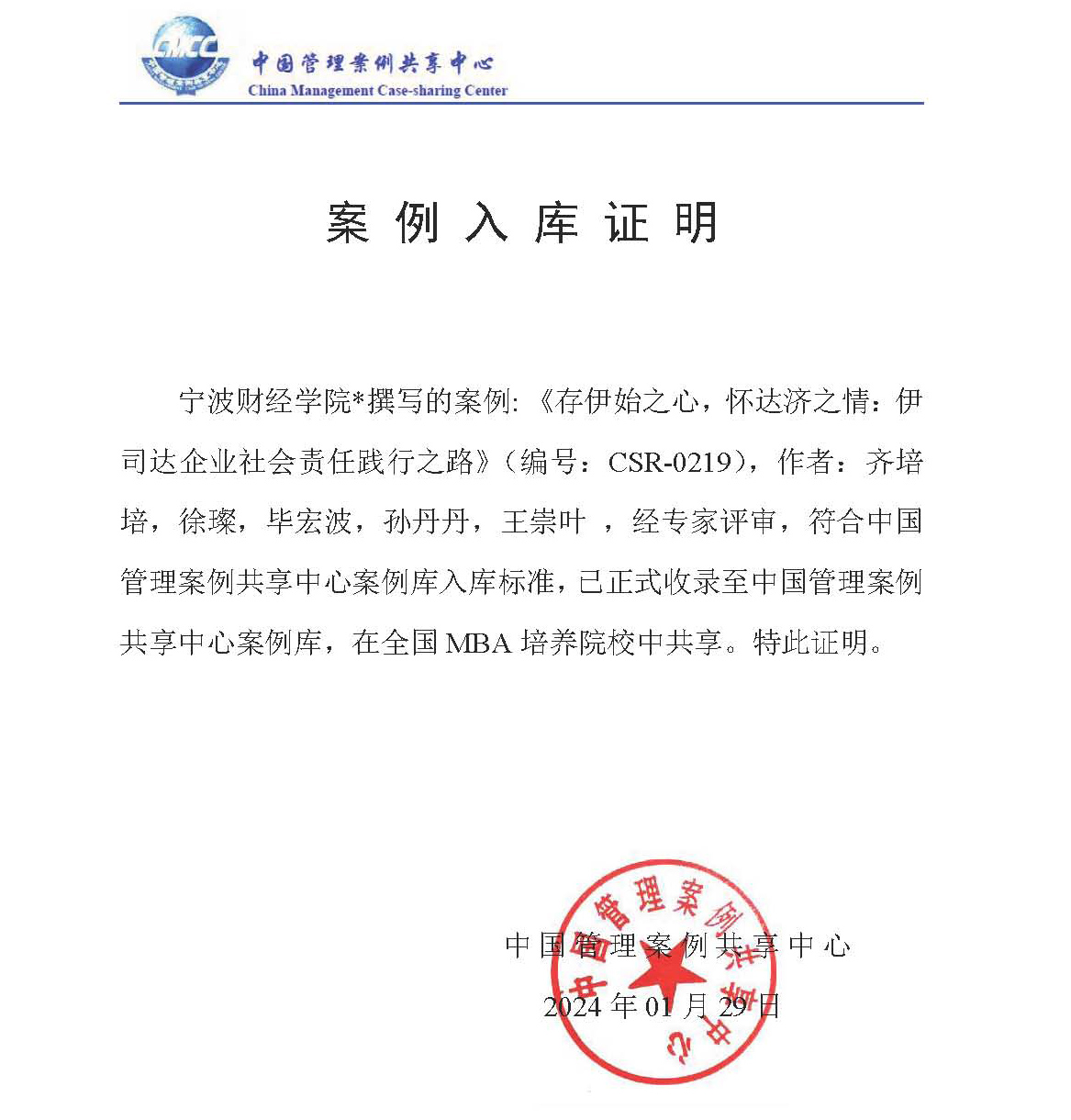 2025年3月伊司达案例《存伊始之心,怀达济之情:伊司达企业社会责任践行之路》入库中国管理案例共享中心案例库。
