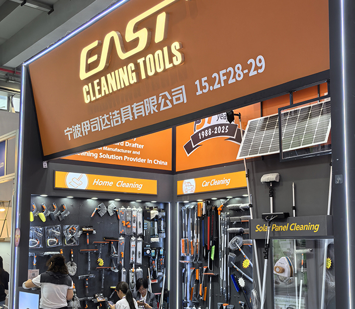 广交会现场,宁波伊司达两大展位惊艳亮相!洁具展区以 “EAST CLEANING TOOLS” 为主题,集中展示家用清洁、汽车清洁、太阳能板清洁等多品类工具,尽显 37 年行业积淀;环保机械展区则聚焦户外设备,从园林工具到家居护理产品,创新技术与丰富品类齐发力。